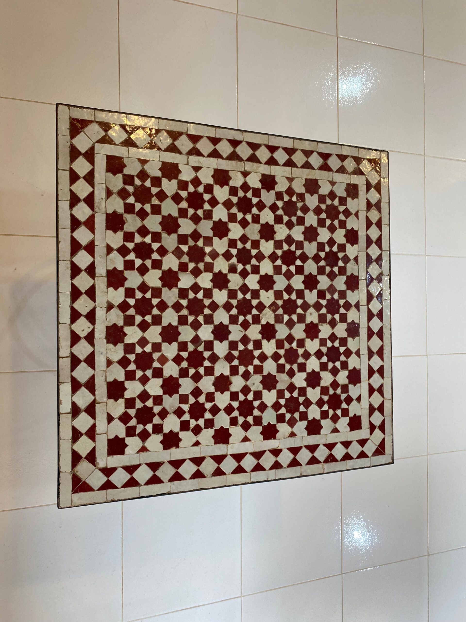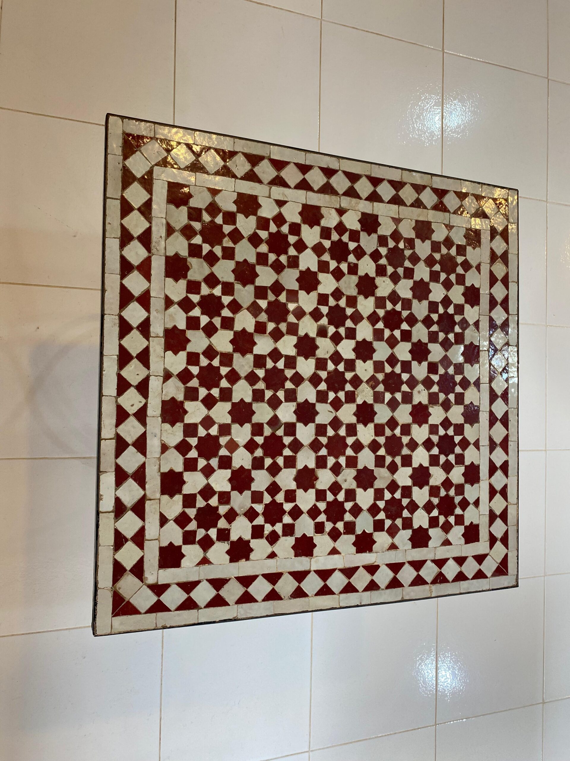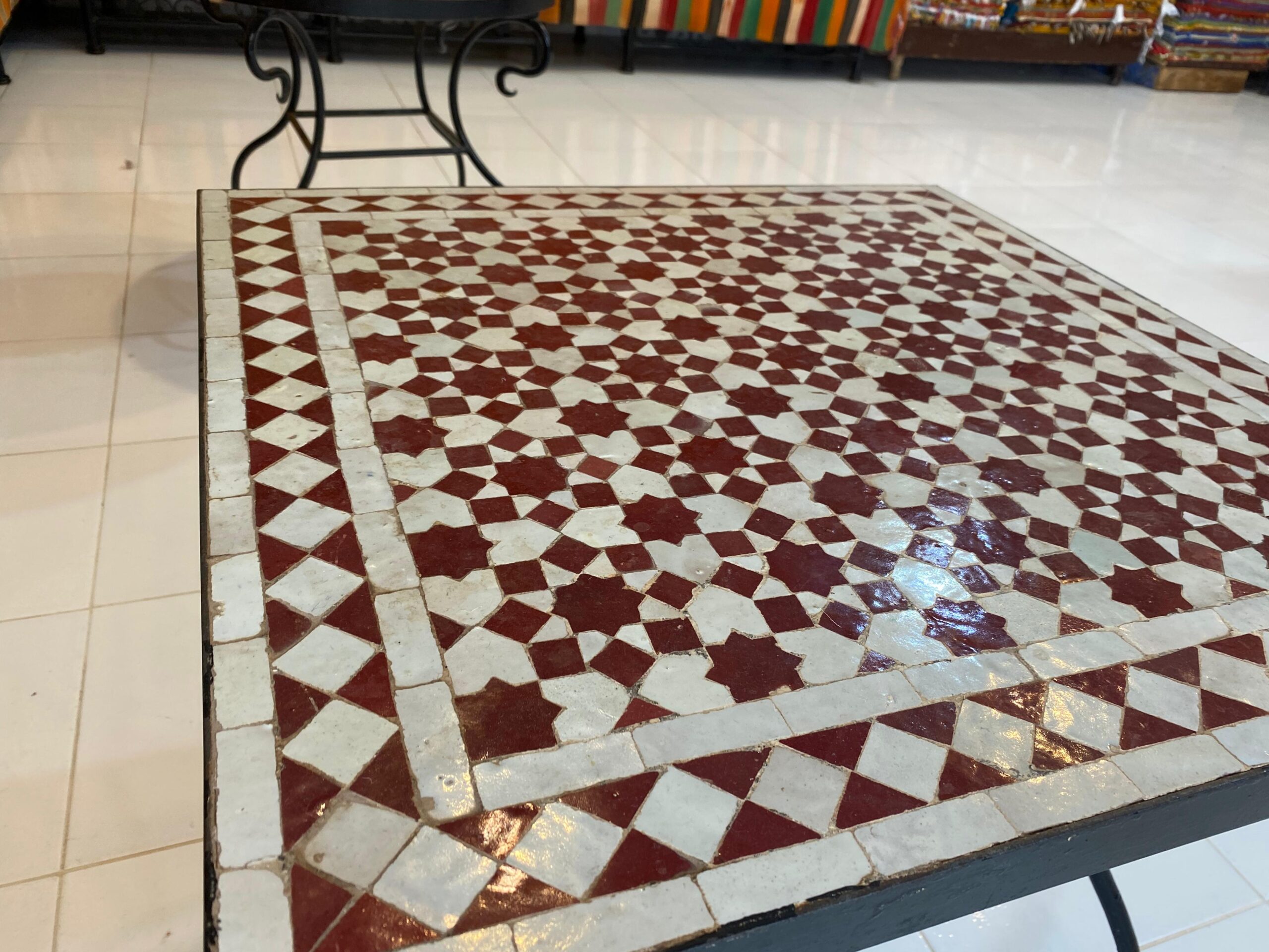 Infuse your space with timeless charm and Moroccan artistry with this elegant handcrafted zellige mosaic table in a deep red and ivory white palette. Featuring a stunning symmetrical geometric pattern inspired by Andalusian and Moorish designs, this table brings authenticity, elegance, and warmth to any setting — whether indoors or outdoors.