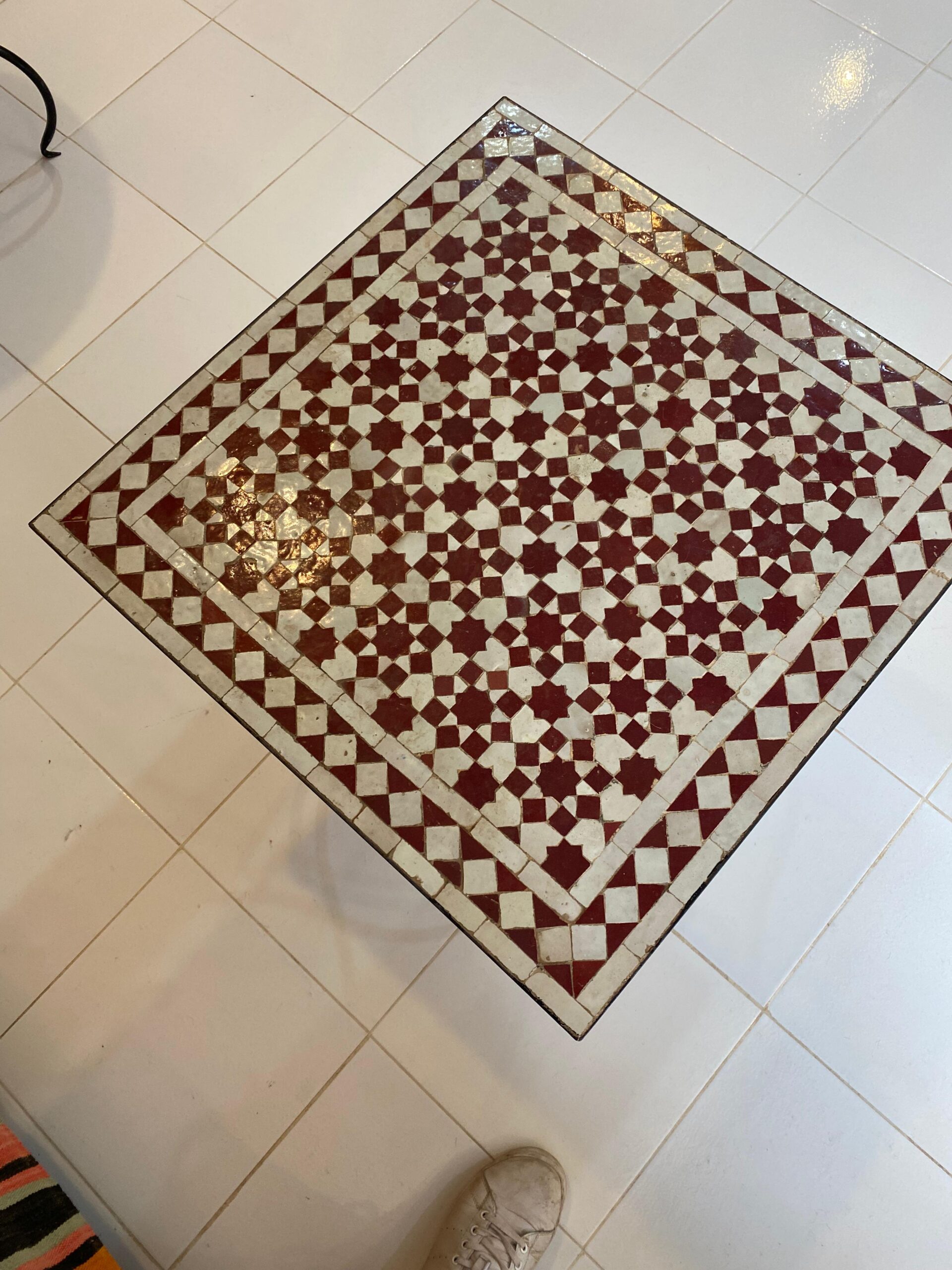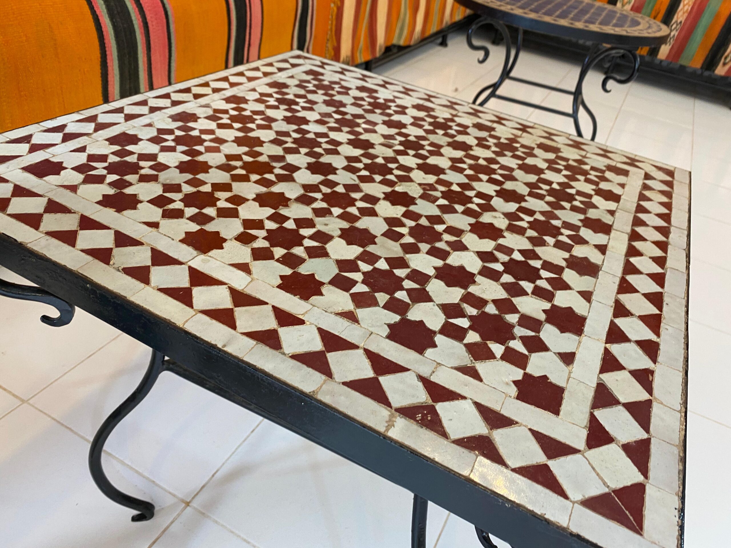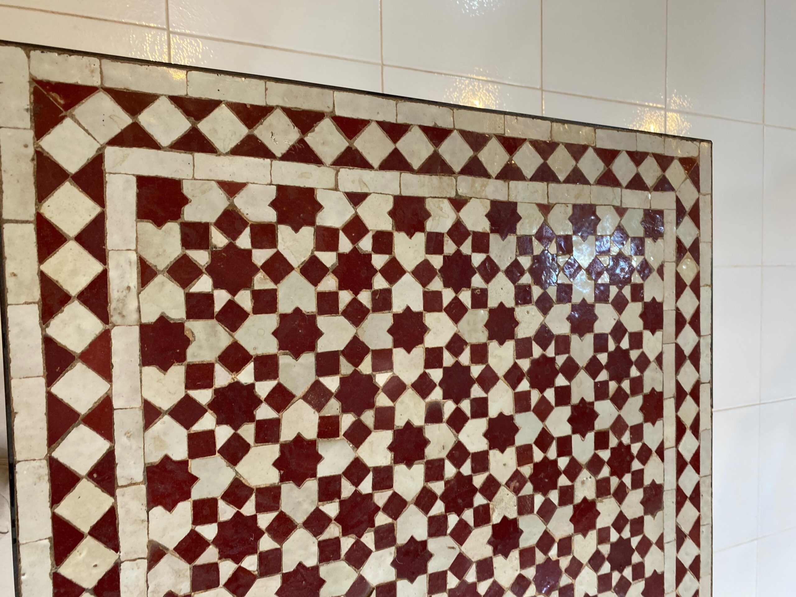 Infuse your space with timeless charm and Moroccan artistry with this elegant handcrafted zellige mosaic table in a deep red and ivory white palette. Featuring a stunning symmetrical geometric pattern inspired by Andalusian and Moorish designs, this table brings authenticity, elegance, and warmth to any setting — whether indoors or outdoors.